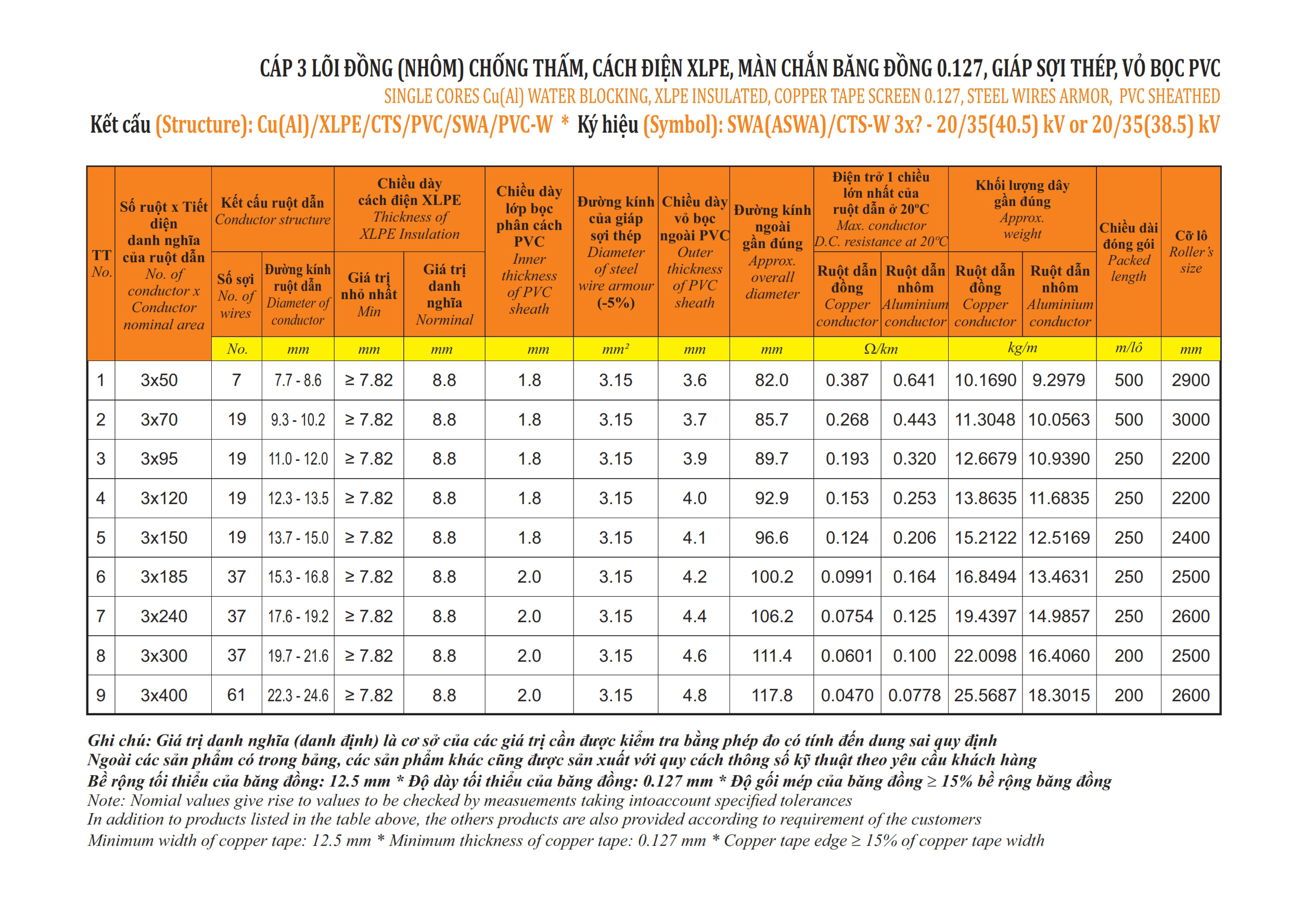 CÁP 3 LÕI, MÀN CHẮN BĂNG ĐỒNG, GIÁP SỢI THÉP - SWA(ASWA)/CTS-W 3X? - 20/35(40.5) KV OR 20/35(38.5) KV