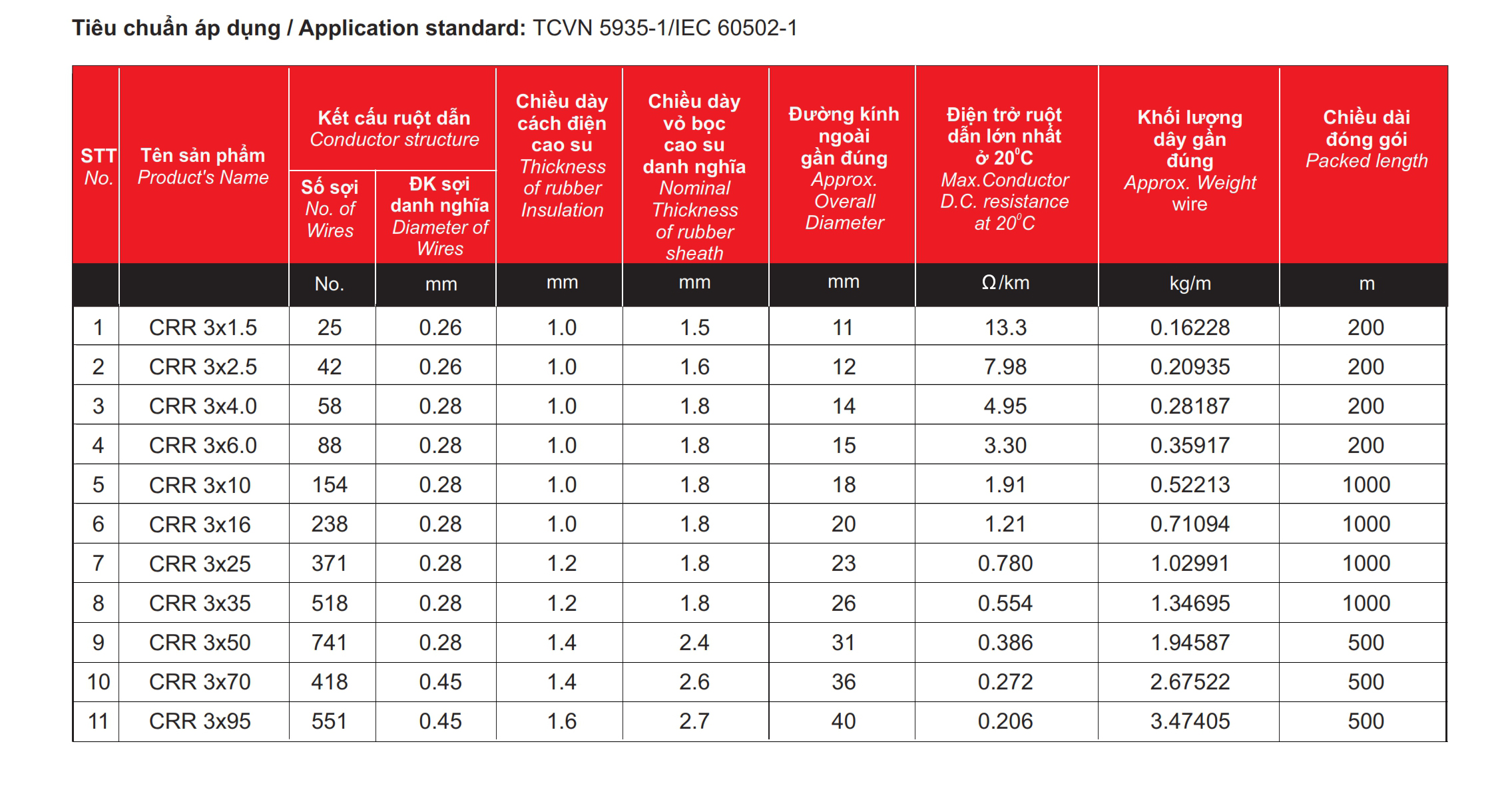 - Vật liệu cách điện và vỏ bọc: Cao su gốc tự nhiên.