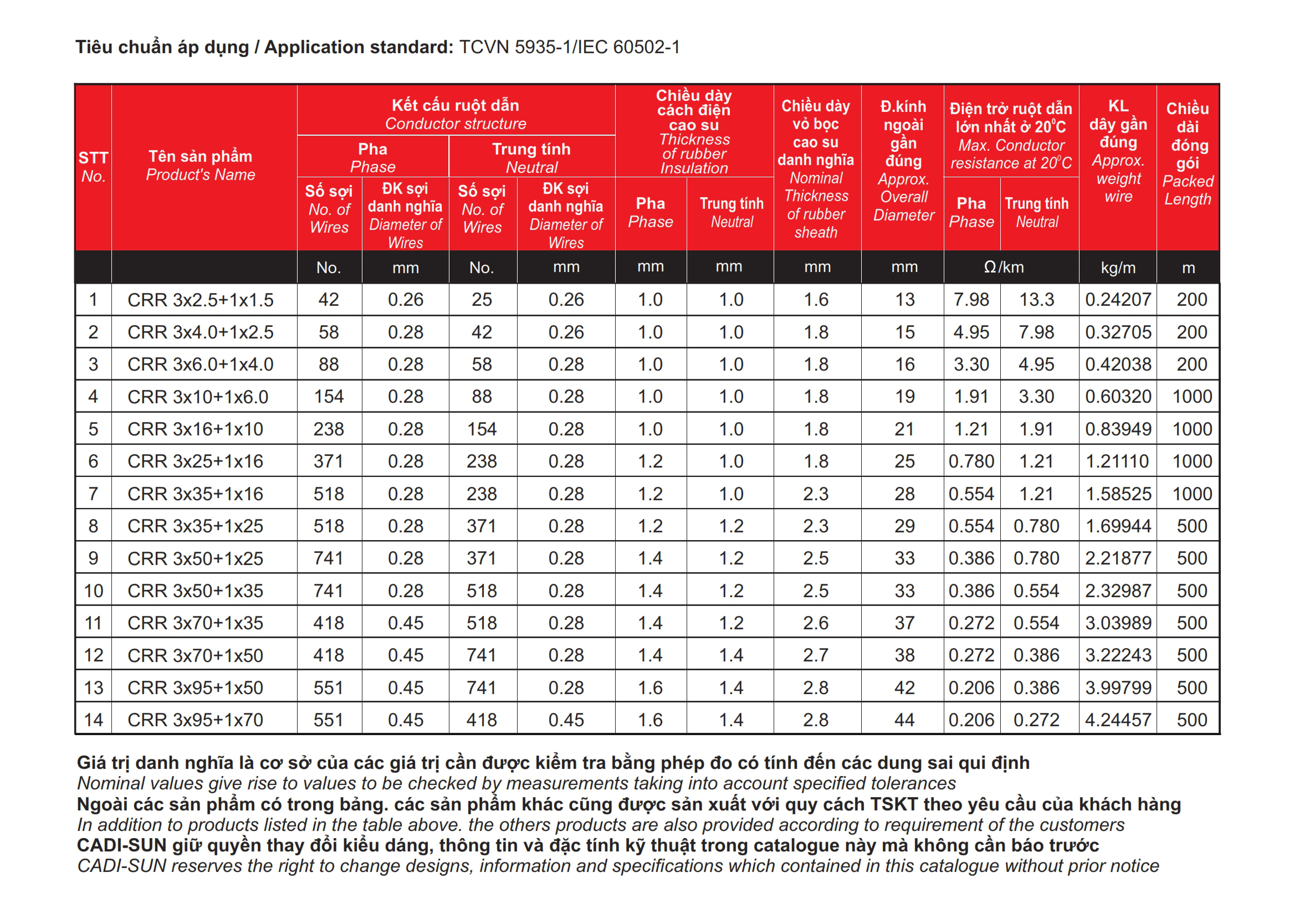 - Vật liệu cách điện và vỏ bọc: Cao su gốc tự nhiên.