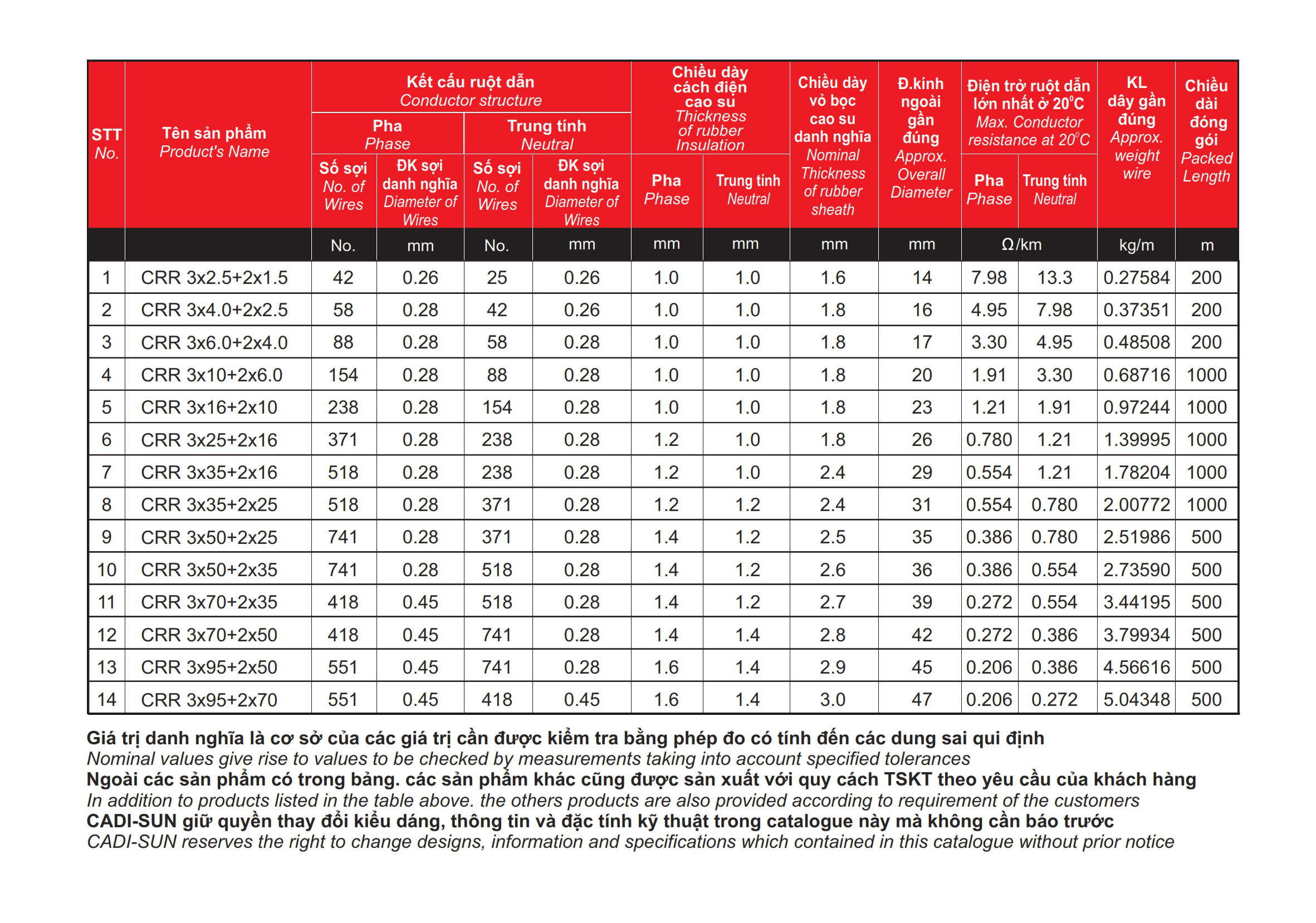 * Ghi chú: Ngoài các quy cách nêu trên, CADI-SUN có thể đáp ứng các yêu cầu khác của khách hàng.