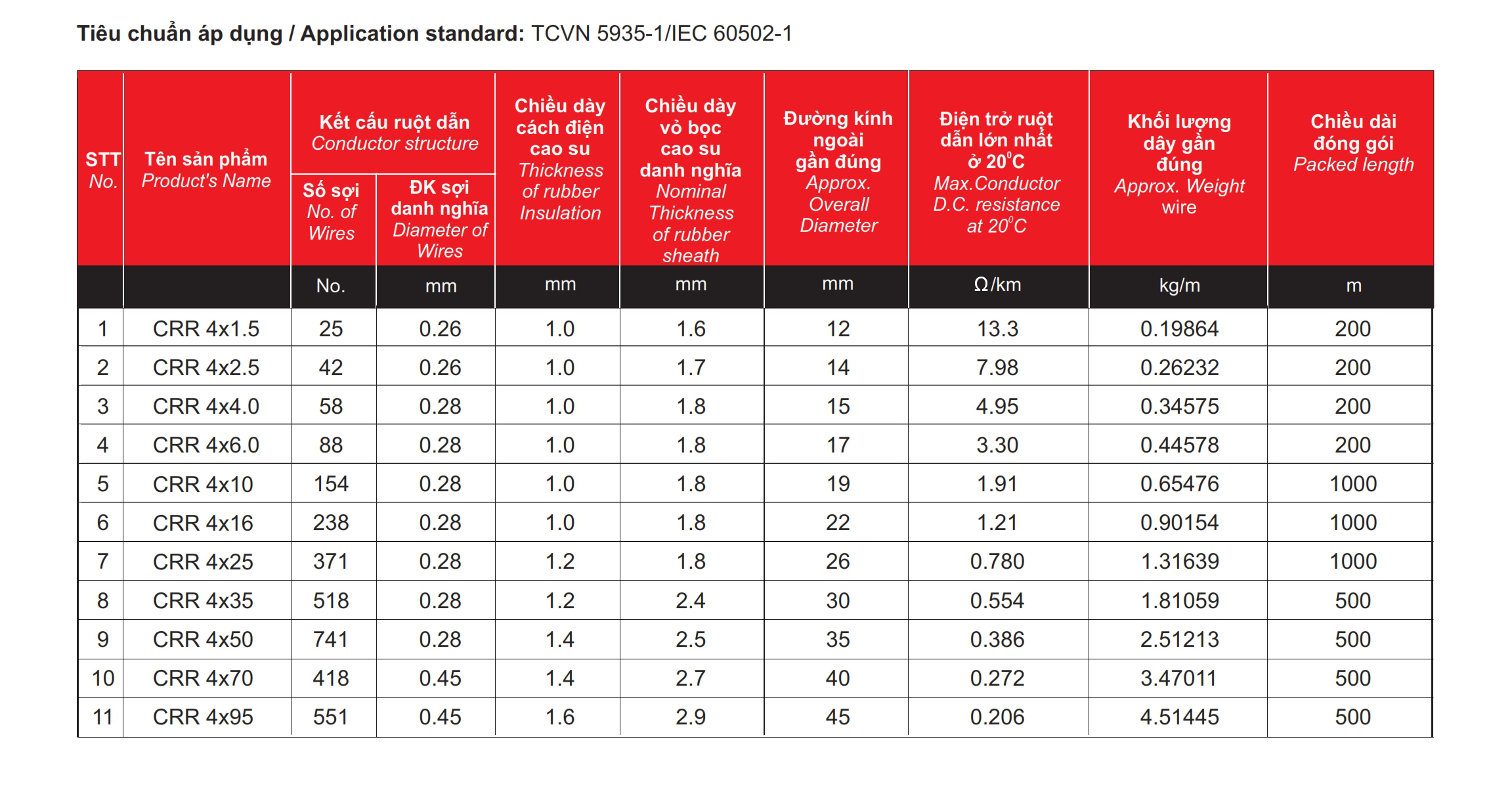 - Vật liệu cách điện và vỏ bọc: Cao su gốc tự nhiên.