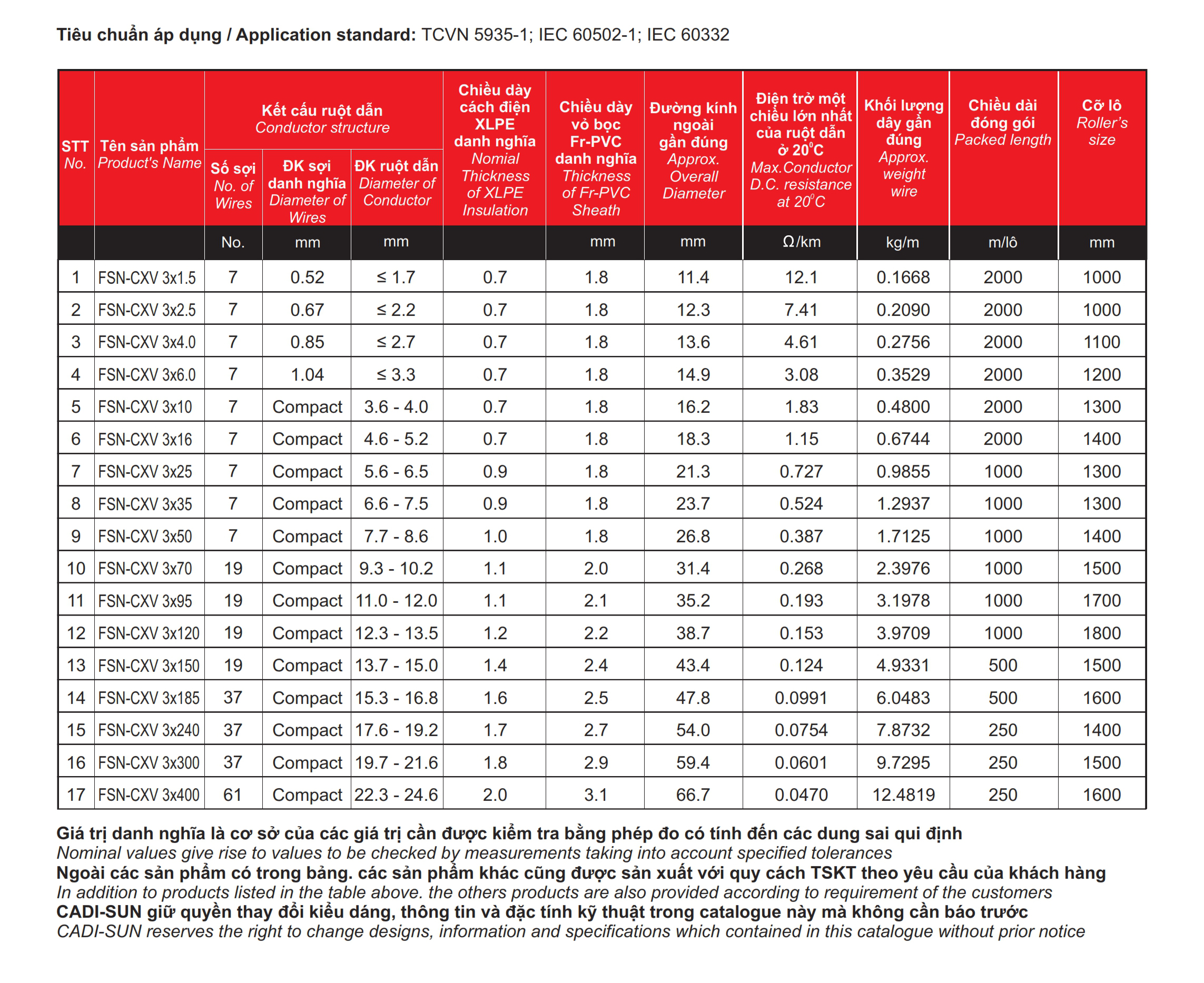 - Mặt cắt danh định: Từ 1.5 mm2 đến 1000 mm2