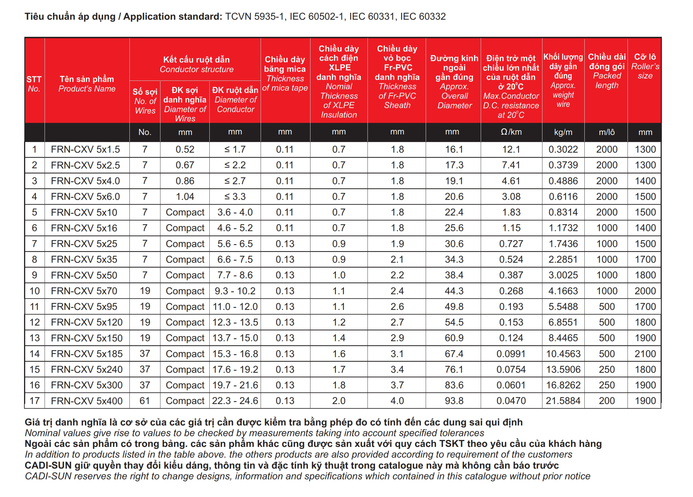 - Quy cách: Cu/Mica/XLPE/Fr-PVC