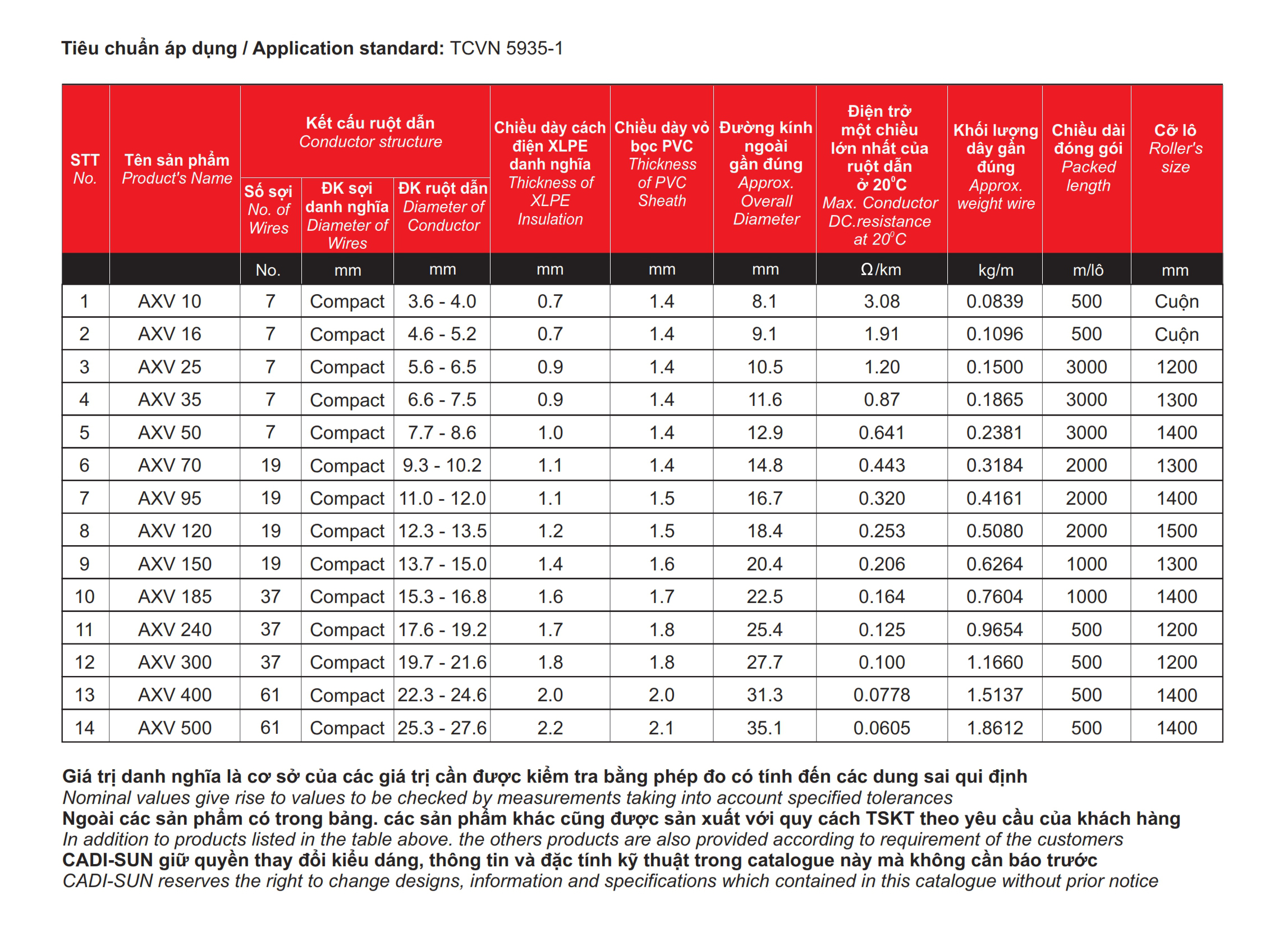 - Quy cách: Al/XLPE/PVC