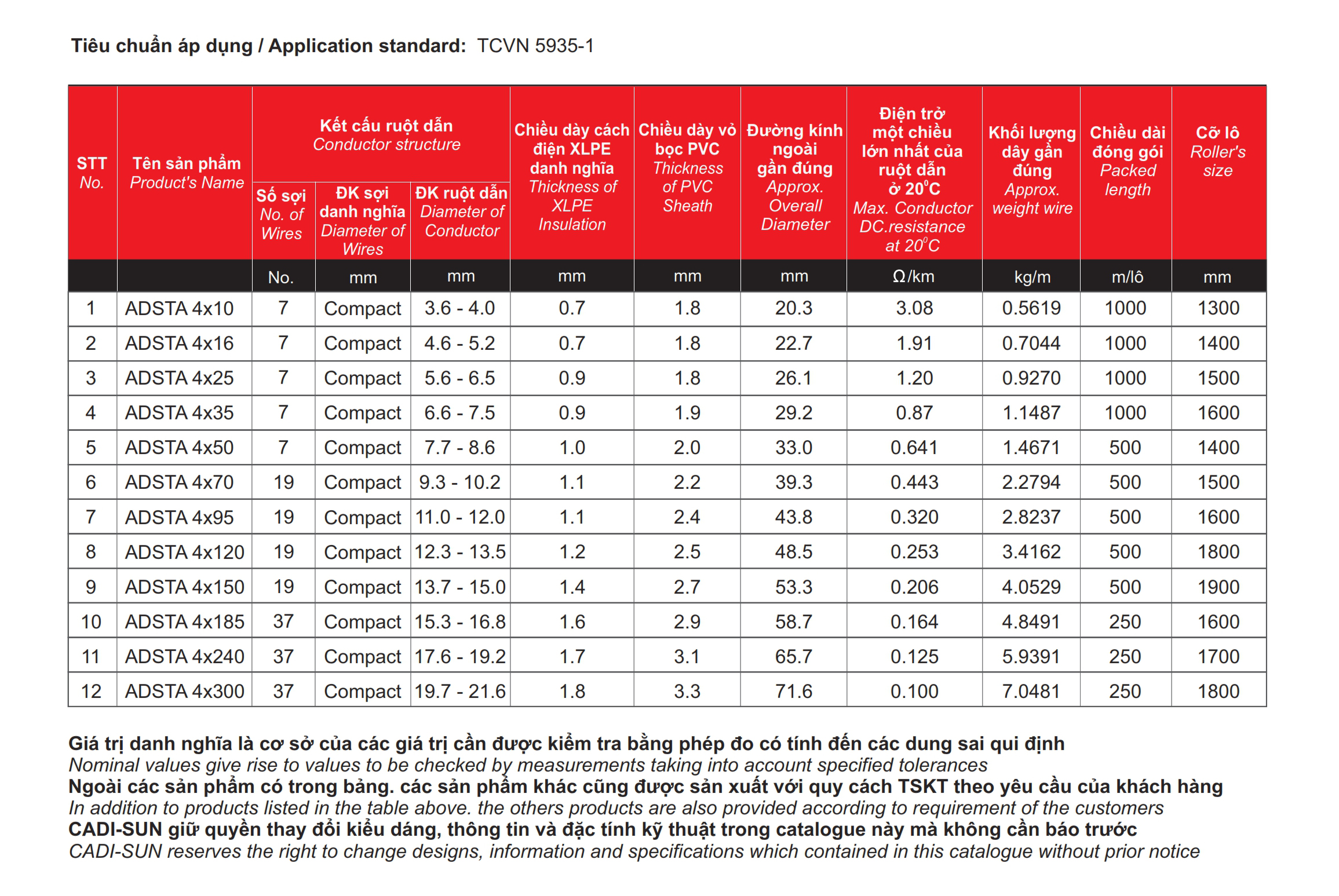 * Ghi chú: Ngoài các quy cách nêu trên, CADI-SUN có thể đáp ứng các yêu cầu khác của khách hàng.