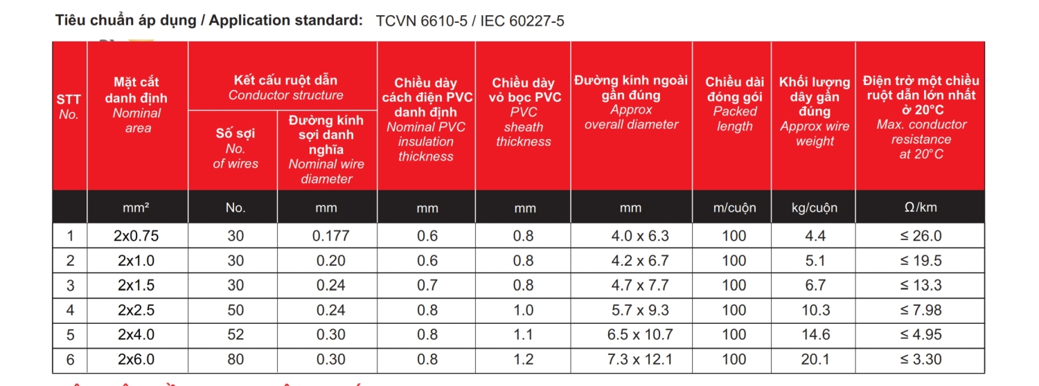 - Mặt cắt danh định: từ 0.75 mm2 đến 6 mm2