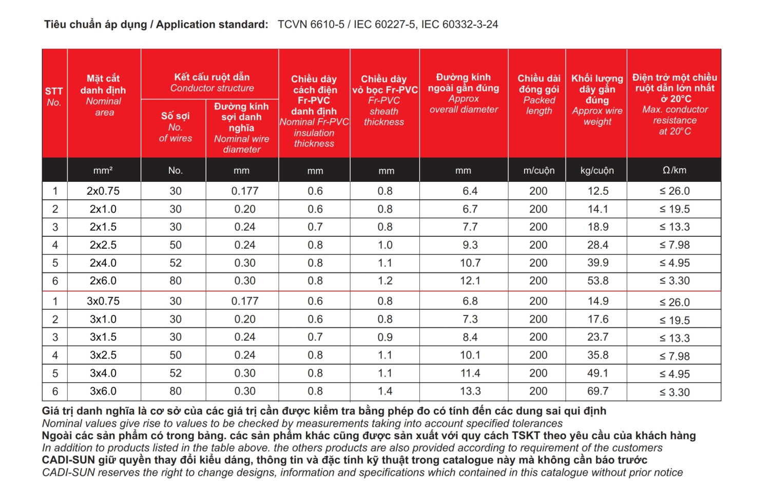 - Quy cách: Cu/Fr-PVC/Fr-PVC